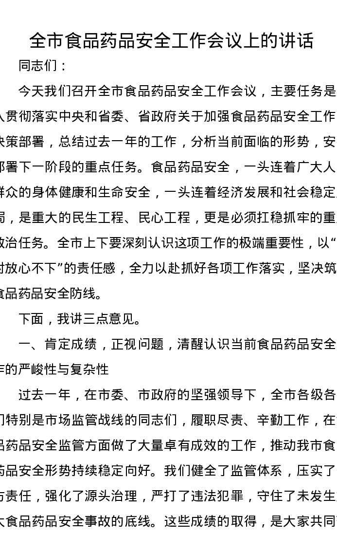 全市食品药品安全工作会议上的讲话