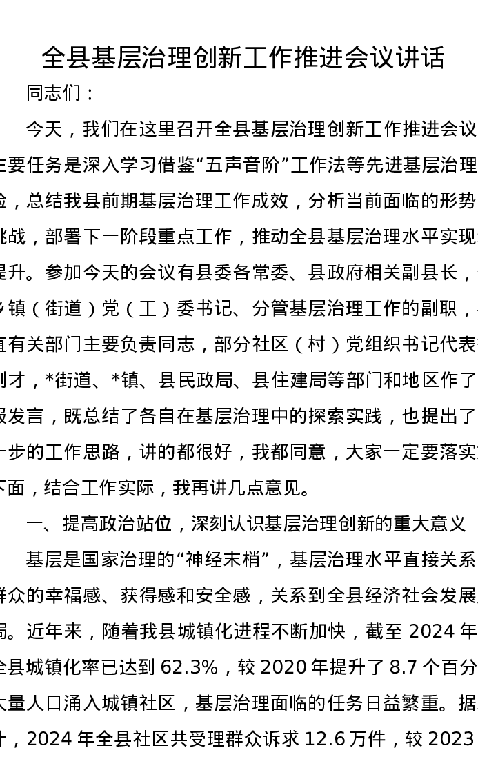 全县基层治理创新工作推进会议讲话