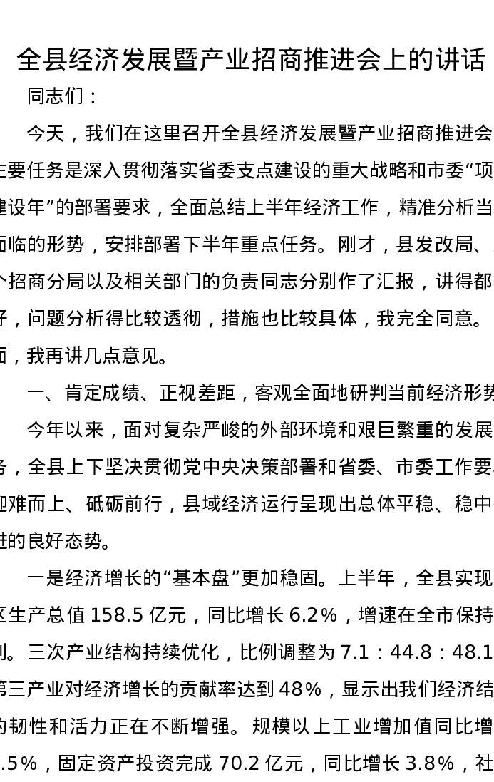 全县经济发展暨产业招商推进会上的讲话