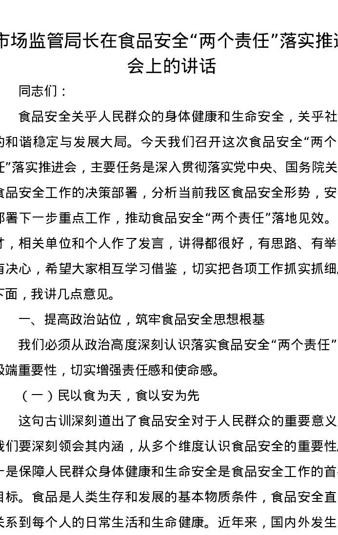 市场监管局长在食品安全“两个责任”落实推进会上的讲话