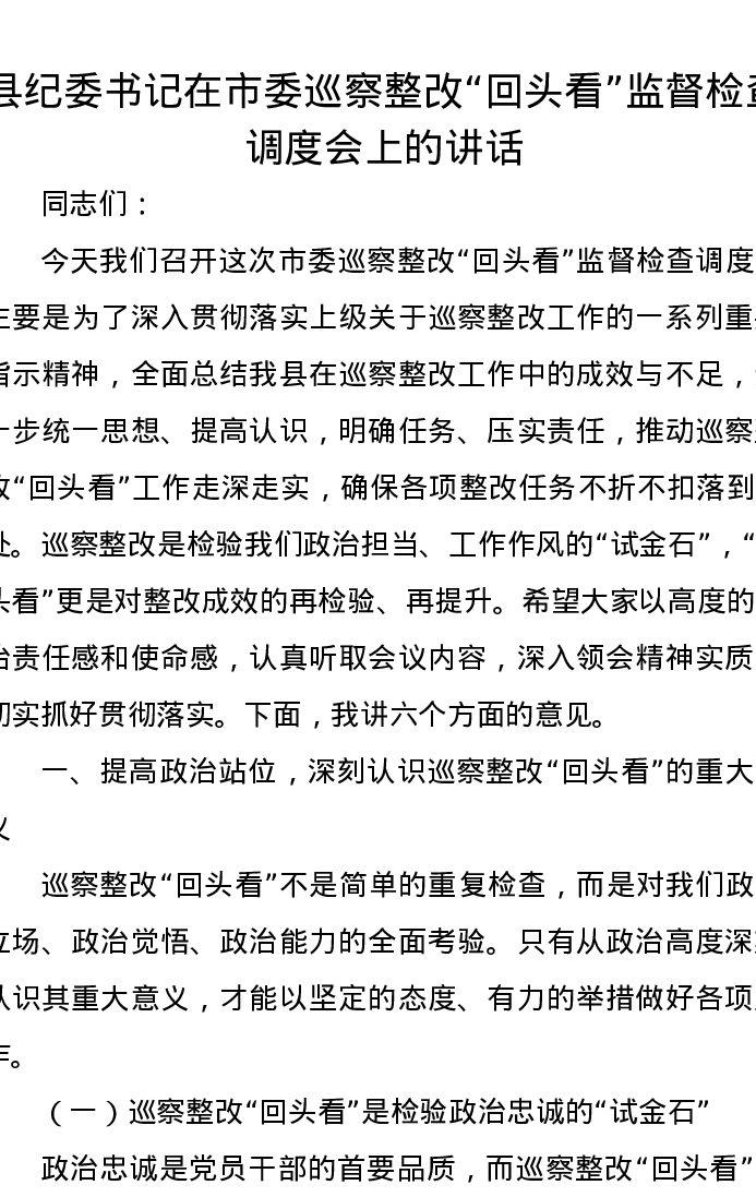 县纪委书记在市委巡察整改“回头看”监督检查调度会上的讲话
