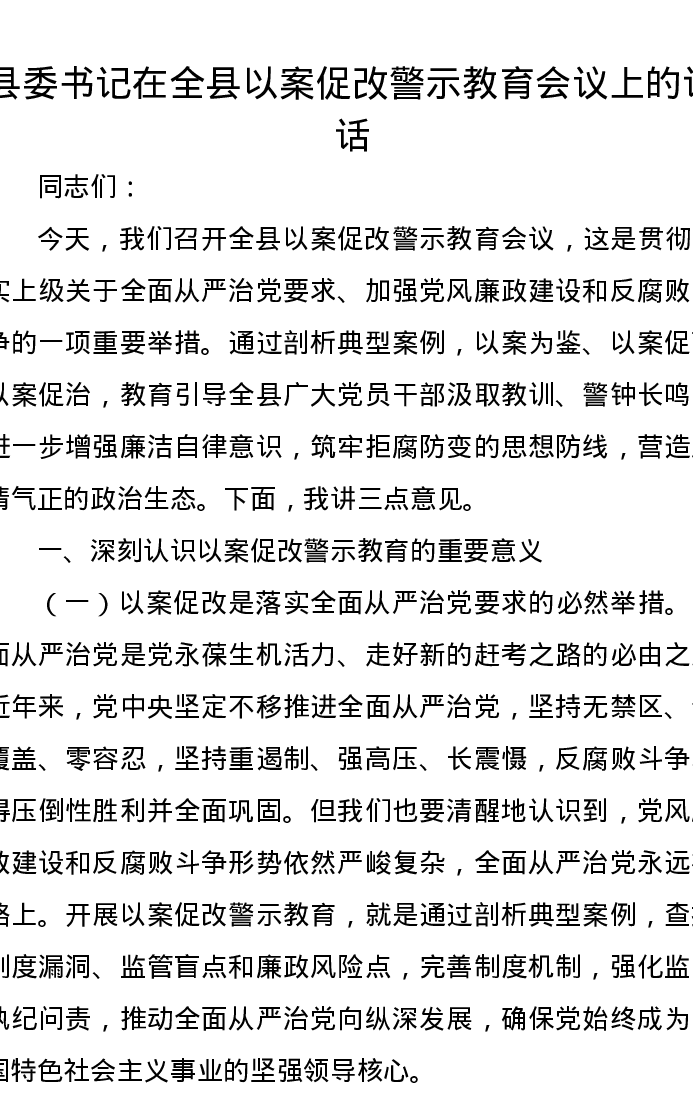县委书记在全县以案促改警示教育会议上的讲话