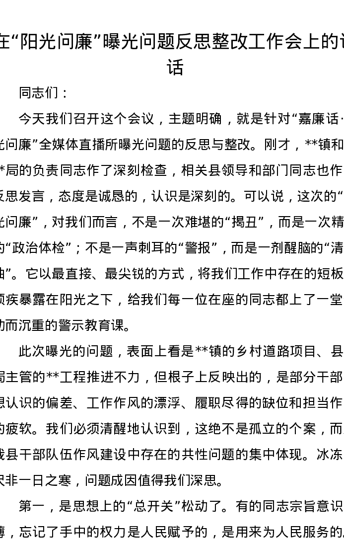 在“阳光问廉”曝光问题反思整改工作会上的讲话