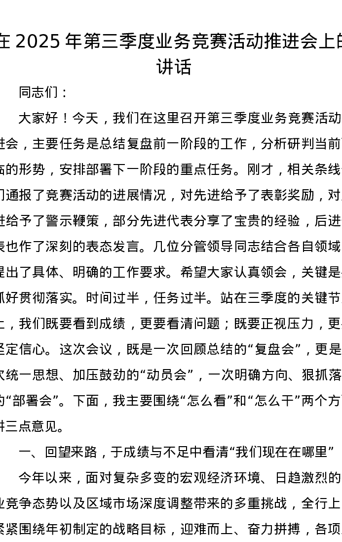 在2025年第三季度业务竞赛活动推进会上的讲话