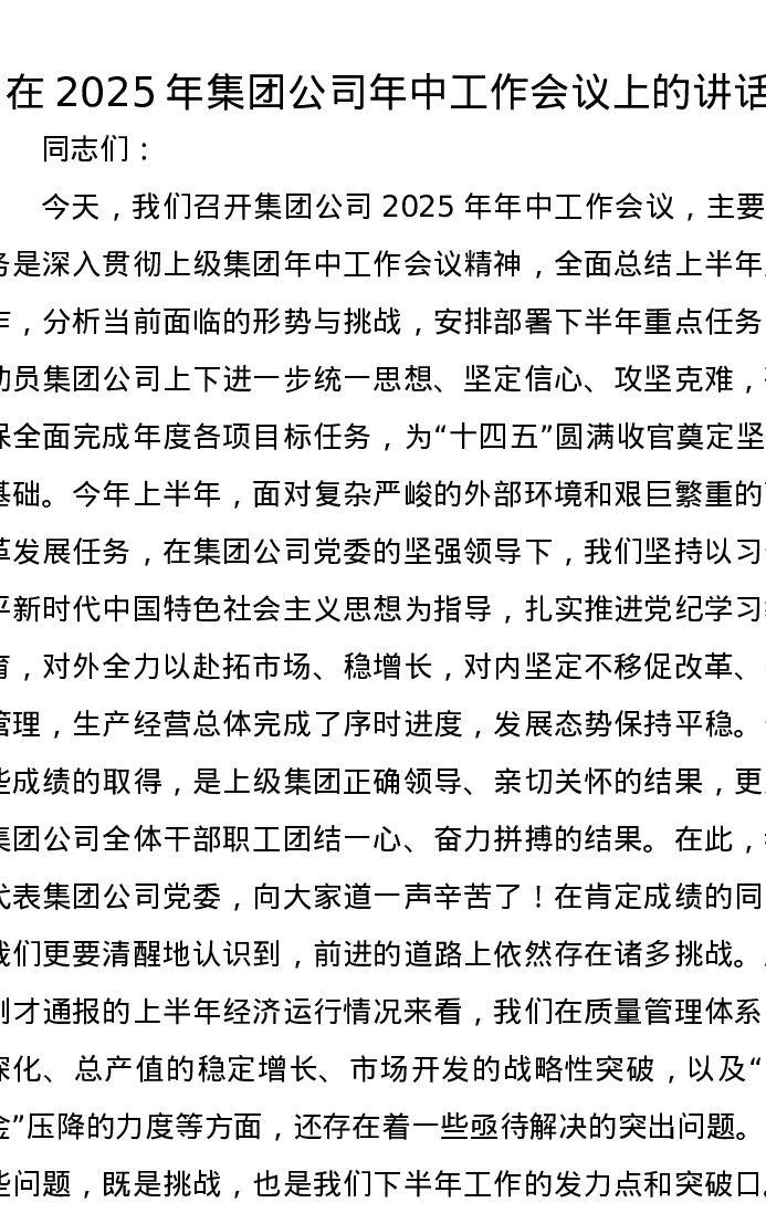 在2025年集团公司年中工作会议上的讲话