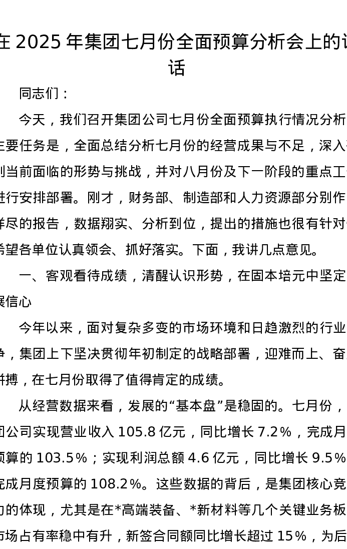 在2025年集团七月份全面预算分析会上的讲话