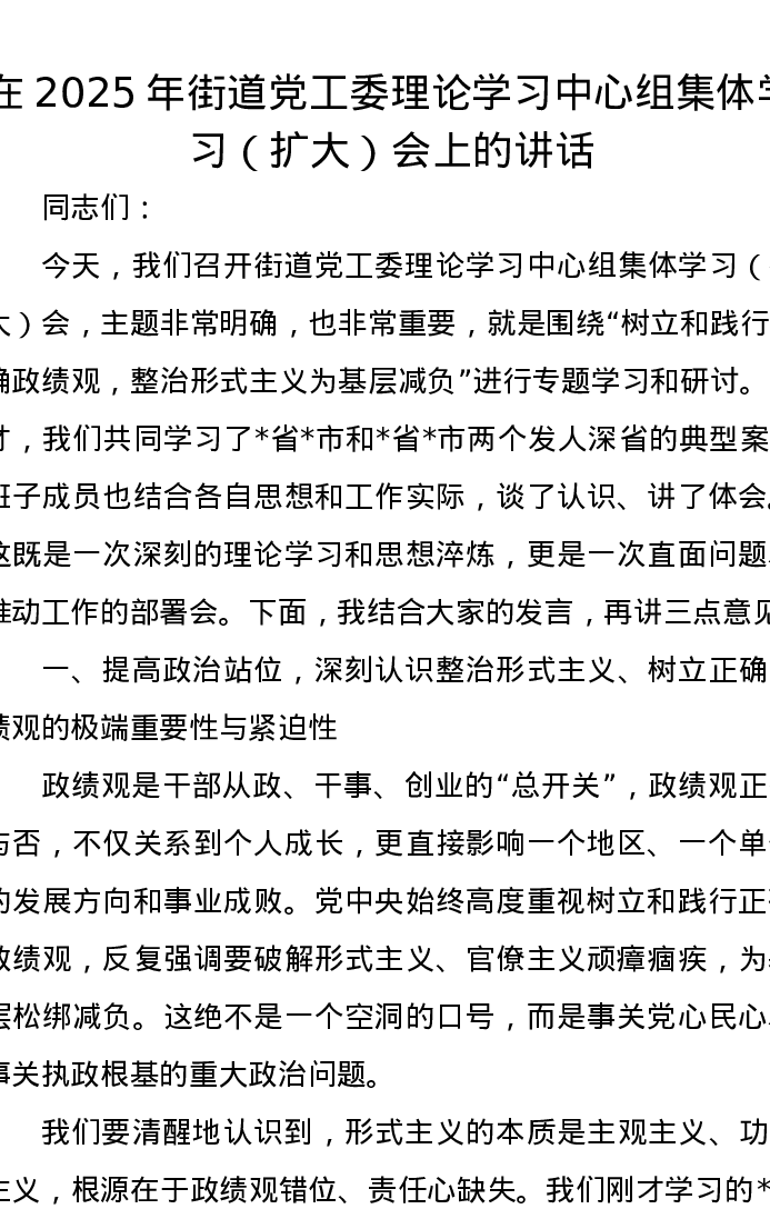 在2025年街道党工委理论学习中心组集体学习(扩大)会上的讲话