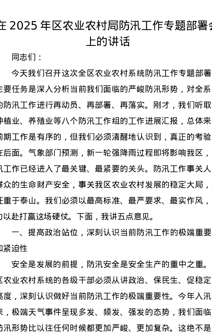 在2025年区农业农村局防汛工作专题部署会上的讲话