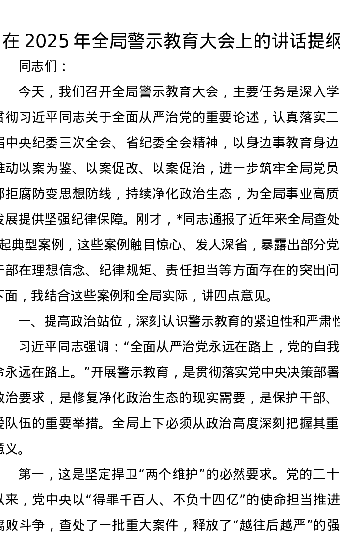 在2025年全局警示教育大会上的讲话提纲