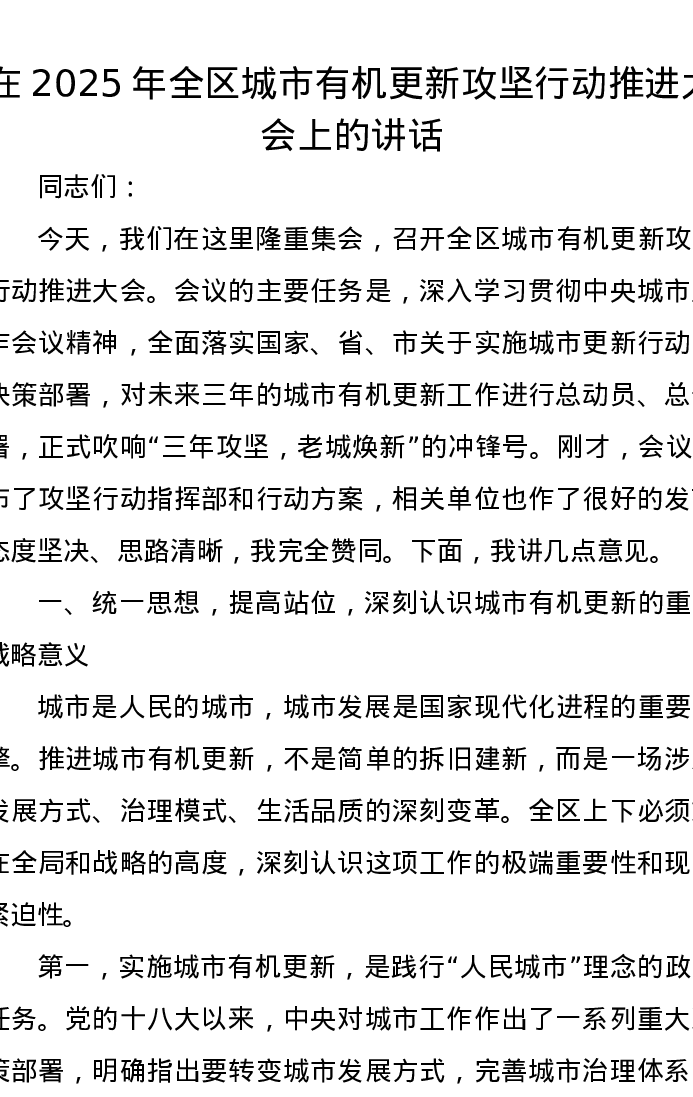 在2025年全区城市有机更新攻坚行动推进大会上的讲话