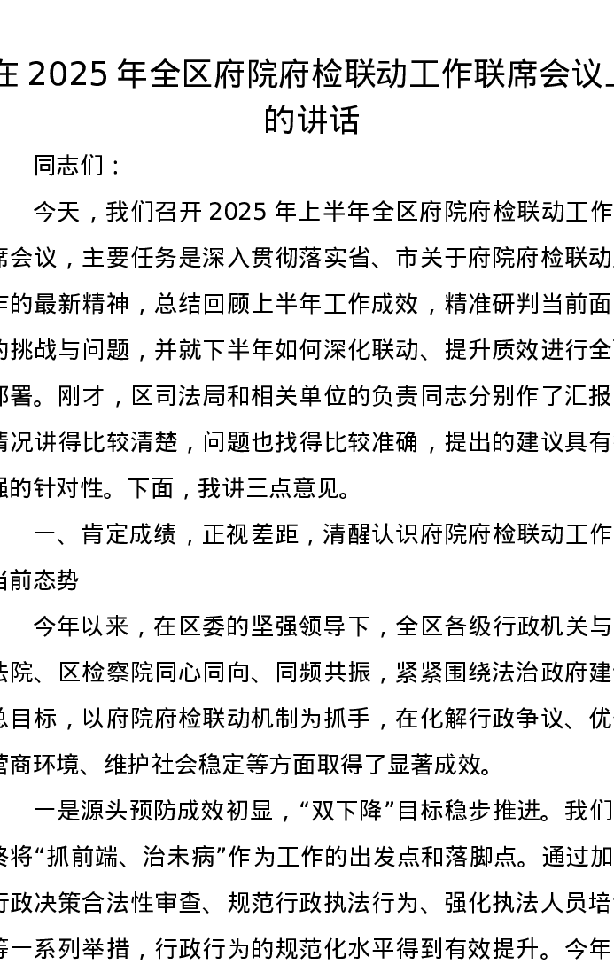 在2025年全区府院府检联动工作联席会议上的讲话