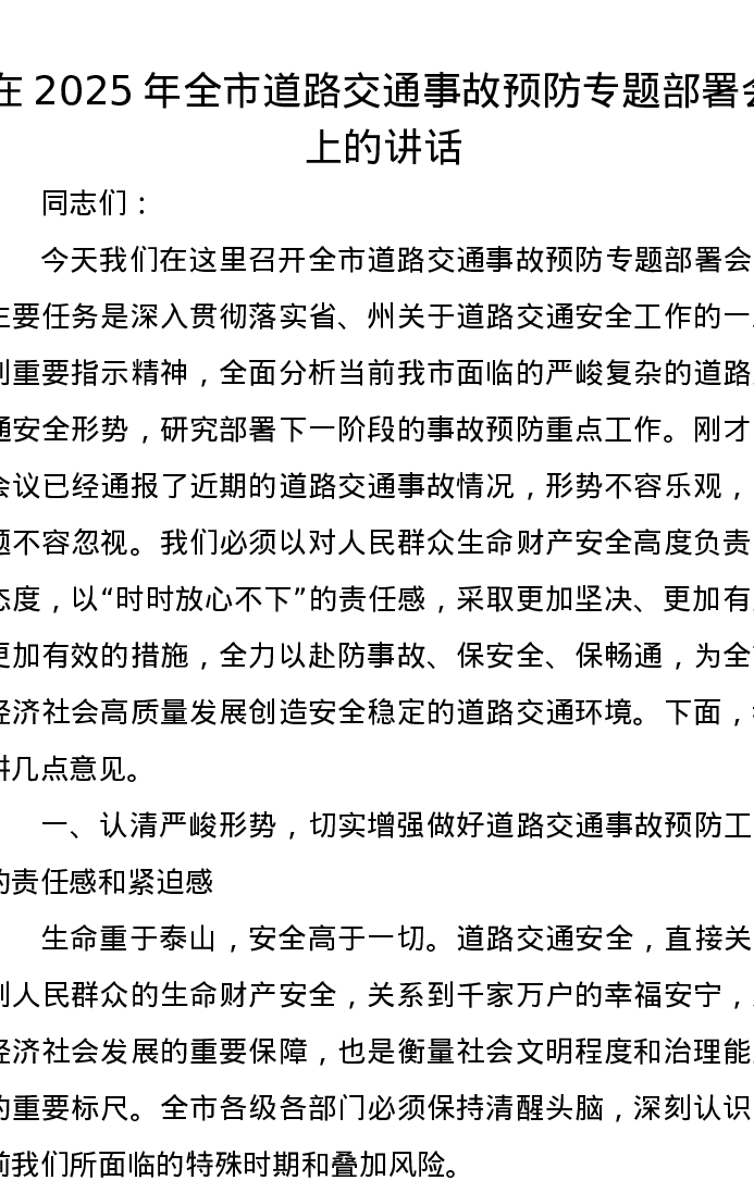 在2025年全市道路交通事故预防专题部署会上的讲话