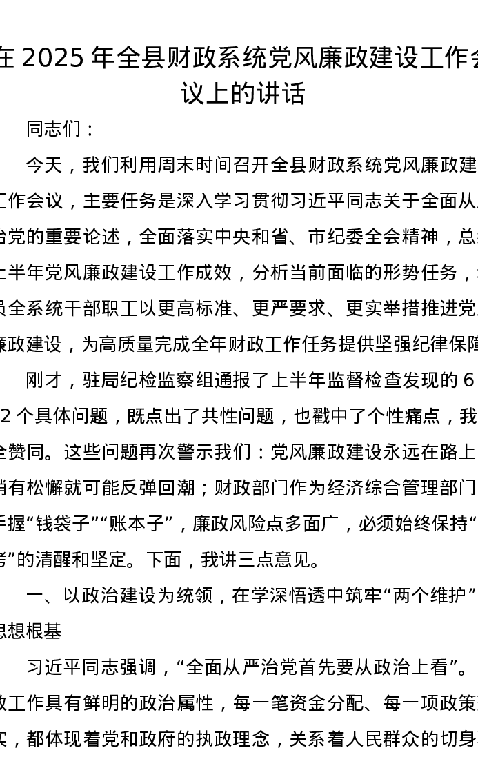 在2025年全县财政系统党风廉政建设工作会议上的讲话