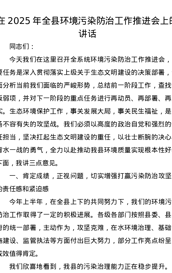 在2025年全县环境污染防治工作推进会上的讲话