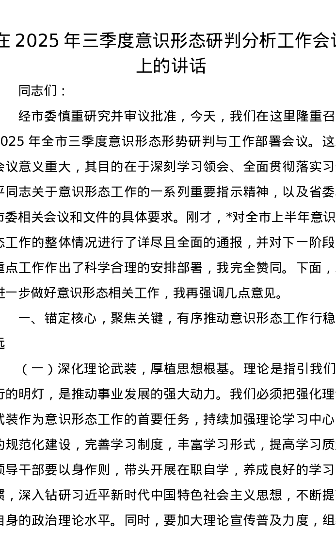 在2025年三季度意识形态研判分析工作会议上的讲话
