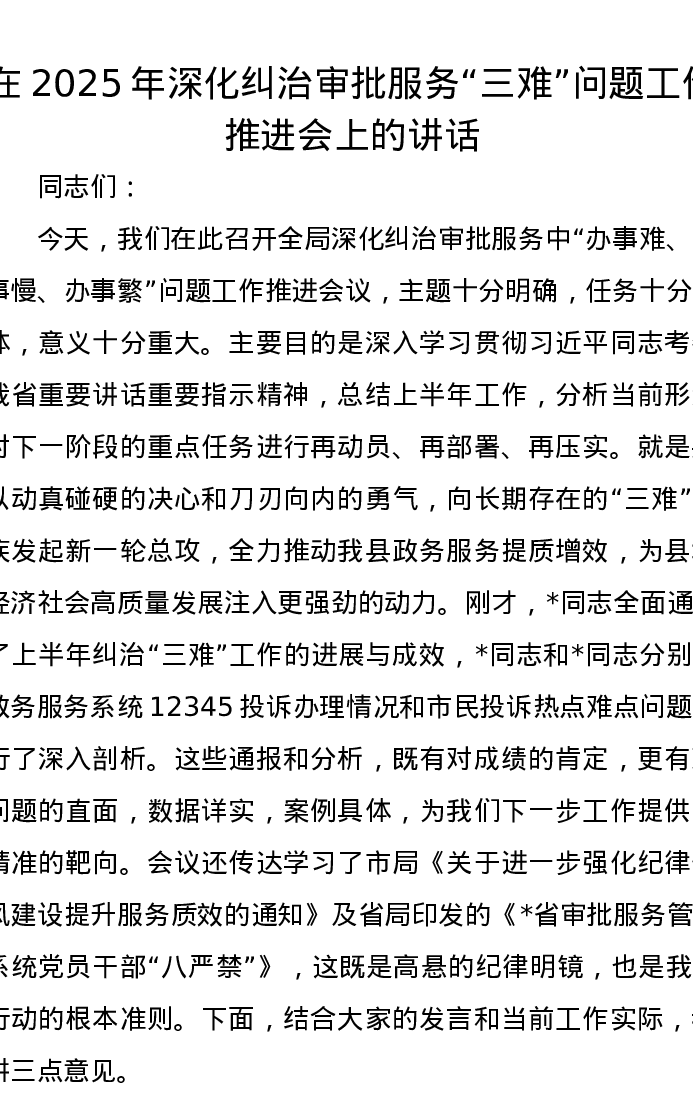 在2025年深化纠治审批服务“三难”问题工作推进会上的讲话