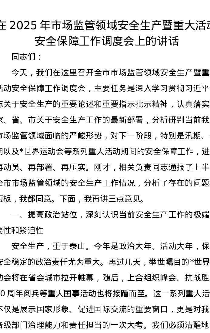 在2025年市场监管领域安全生产暨重大活动安全保障工作调度会上的讲话