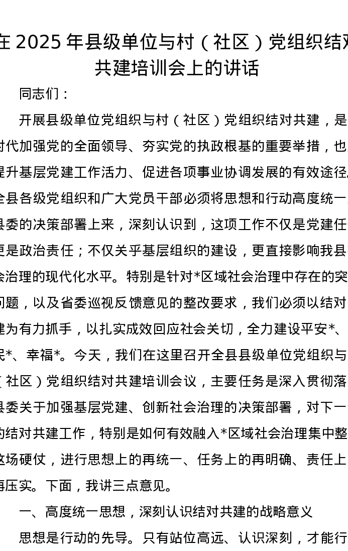 在2025年县级单位与村(社区)党组织结对共建培训会上的讲话