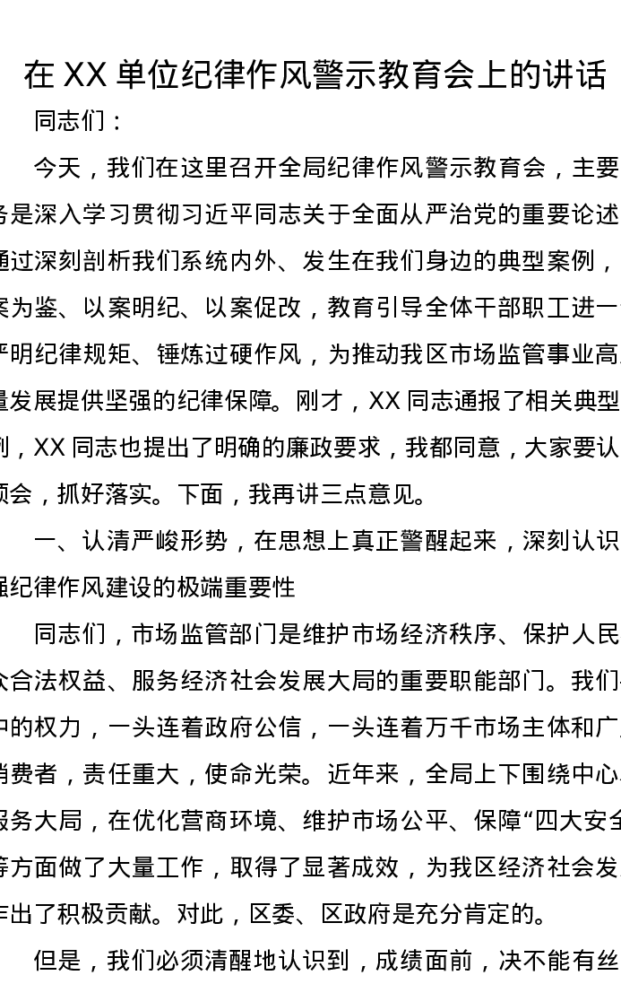 在XX单位纪律作风警示教育会上的讲话