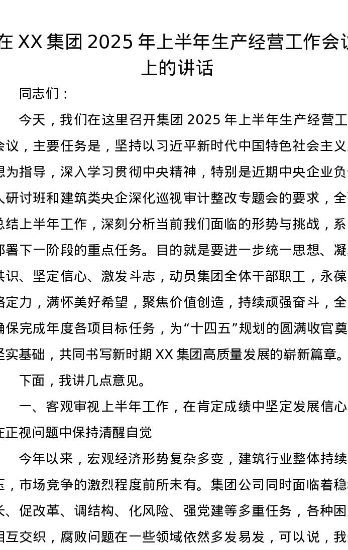 在XX集团2025年上半年生产经营工作会议上的讲话