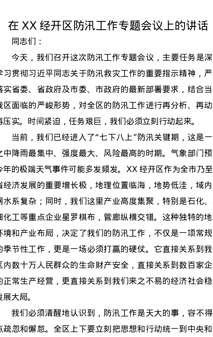 在XX经开区防汛工作专题会议上的讲话
