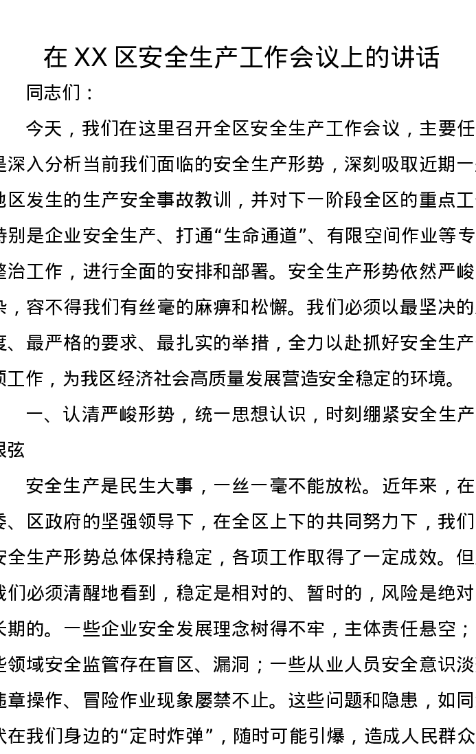 在XX区安全生产工作会议上的讲话