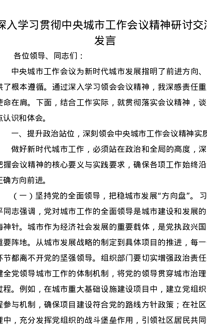 深入学习贯彻中央城市工作会议精神研讨交流发言