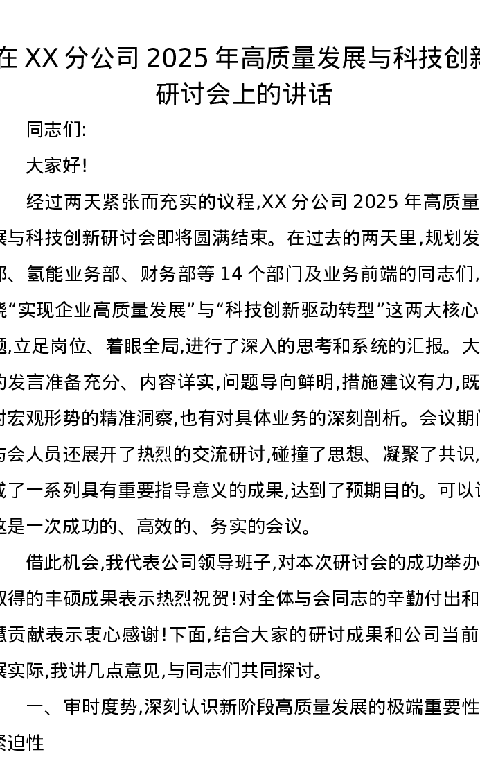 在XX分公司2025年高质量发展与科技创新研讨会上的讲话