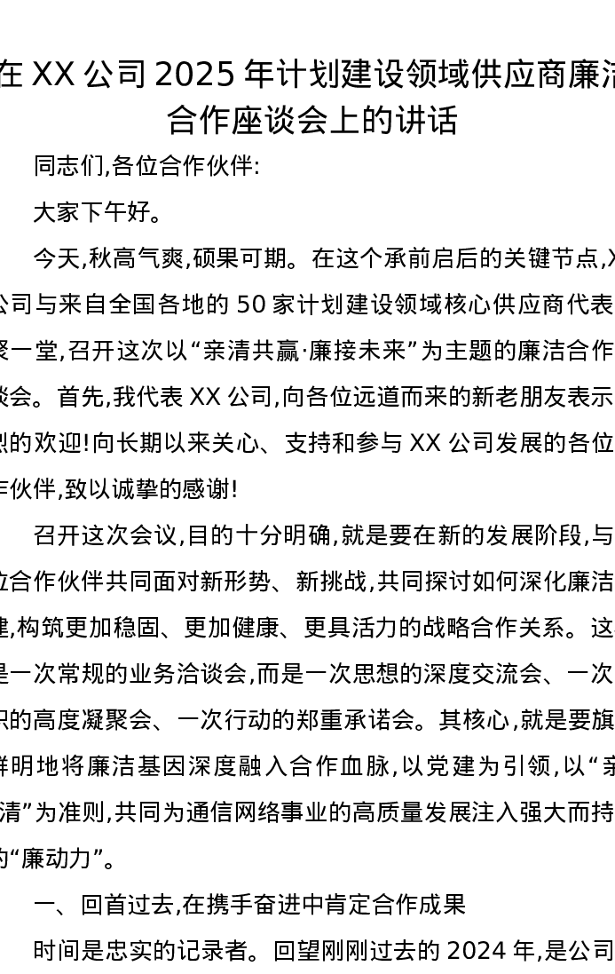 在XX公司2025年计划建设领域供应商廉洁合作座谈会上的讲话