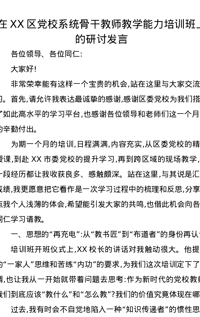 在XX区党校系统骨干教师教学能力培训班上的研讨发言