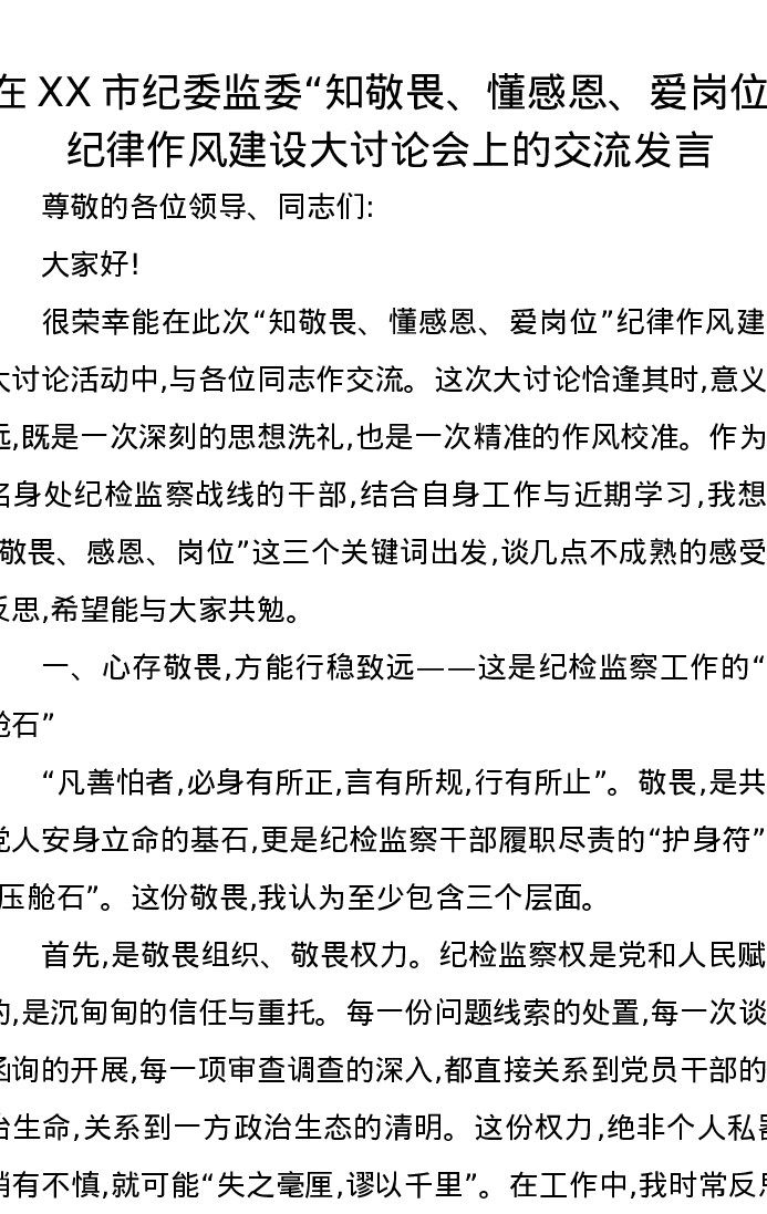 在XX市纪委监委“知敬畏、懂感恩、爱岗位”纪律作风建设大讨论会上的交流发言
