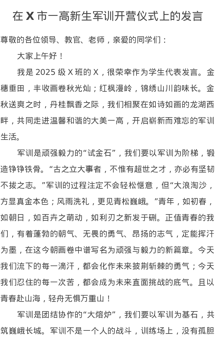 在X市一高新生军训开营仪式上的发言