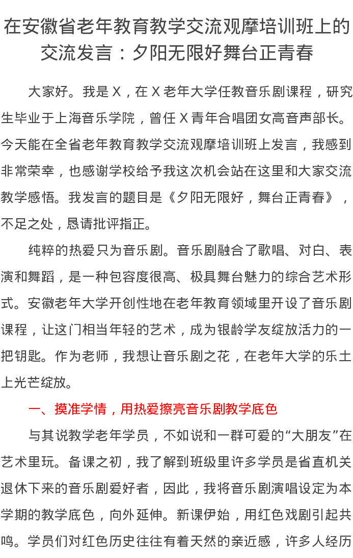 在安徽省老年教育教学交流观摩培训班上的交流发言:夕阳无限好舞台正青春