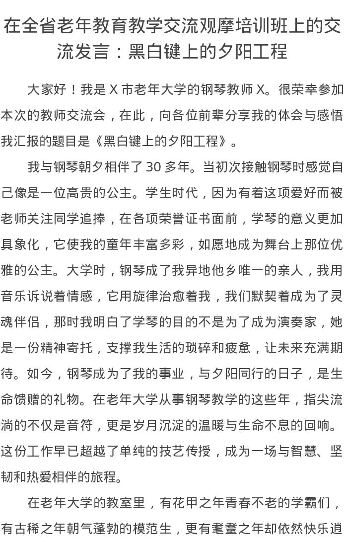 在全省老年教育教学交流观摩培训班上的交流发言:黑白键上的夕阳工程