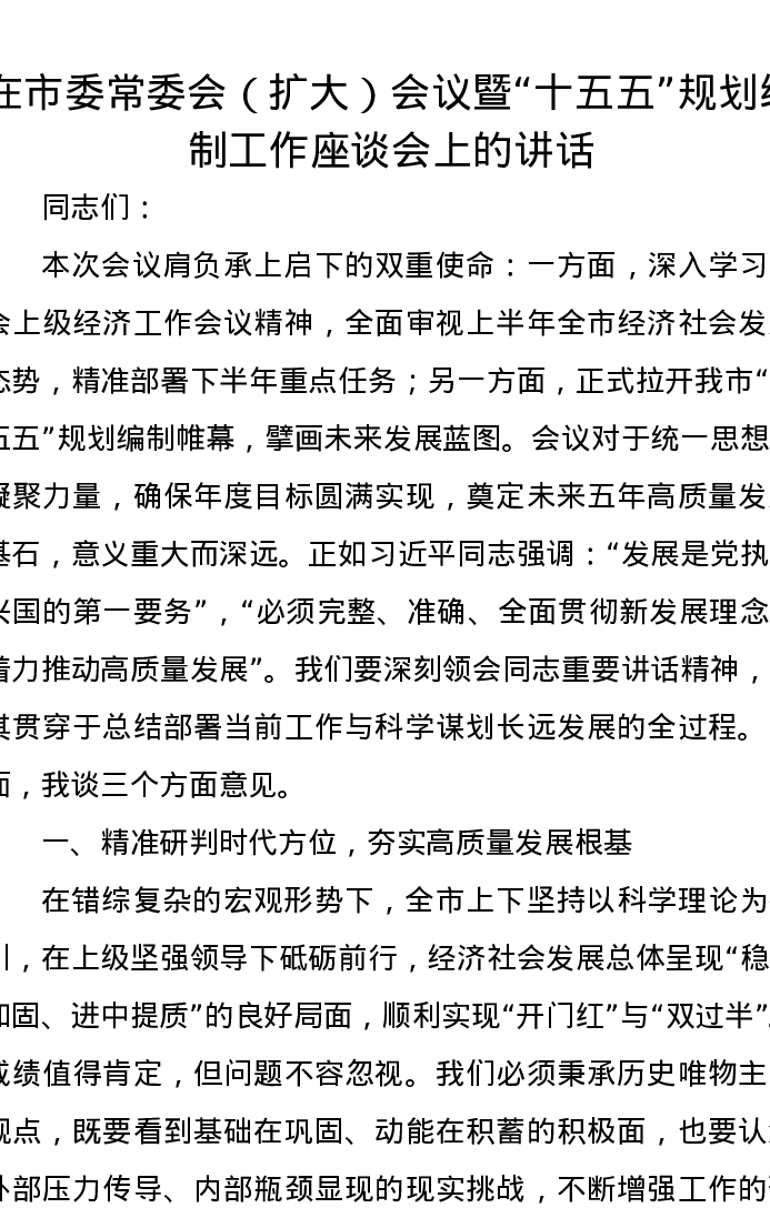 在市委常委会(扩大)会议暨“十五五”规划编制工作座谈会上的讲话