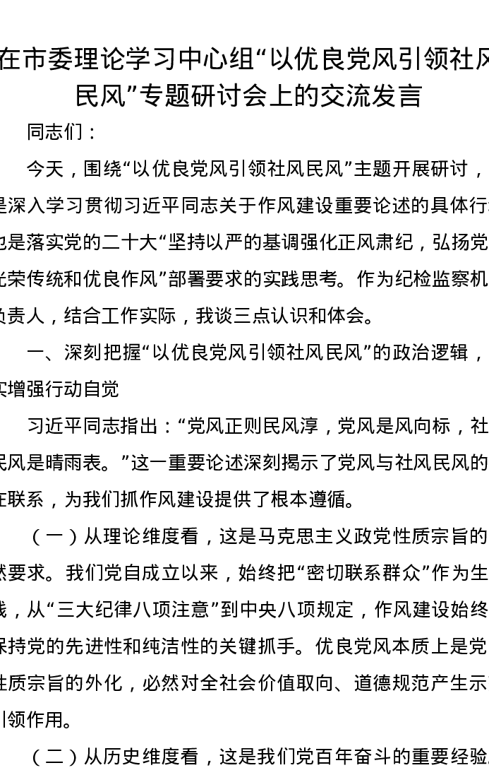 在市委理论学习中心组“以优良党风引领社风民风”专题研讨会上的交流发言