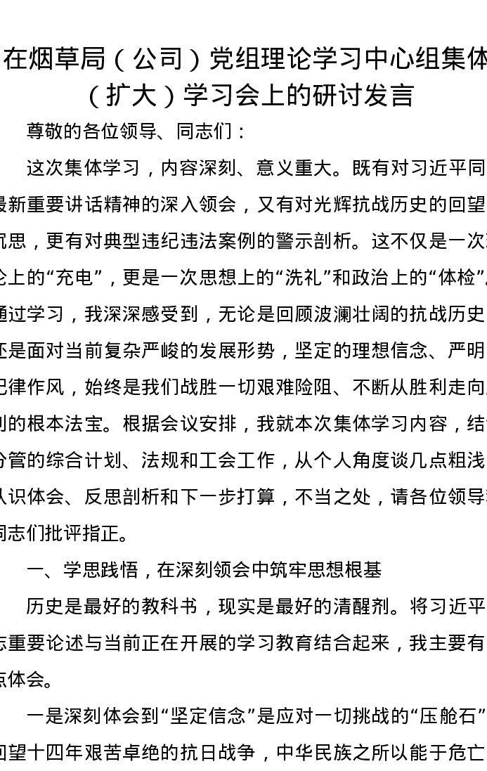 在烟草局(公司)党组理论学习中心组集体(扩大)学习会上的研讨发言