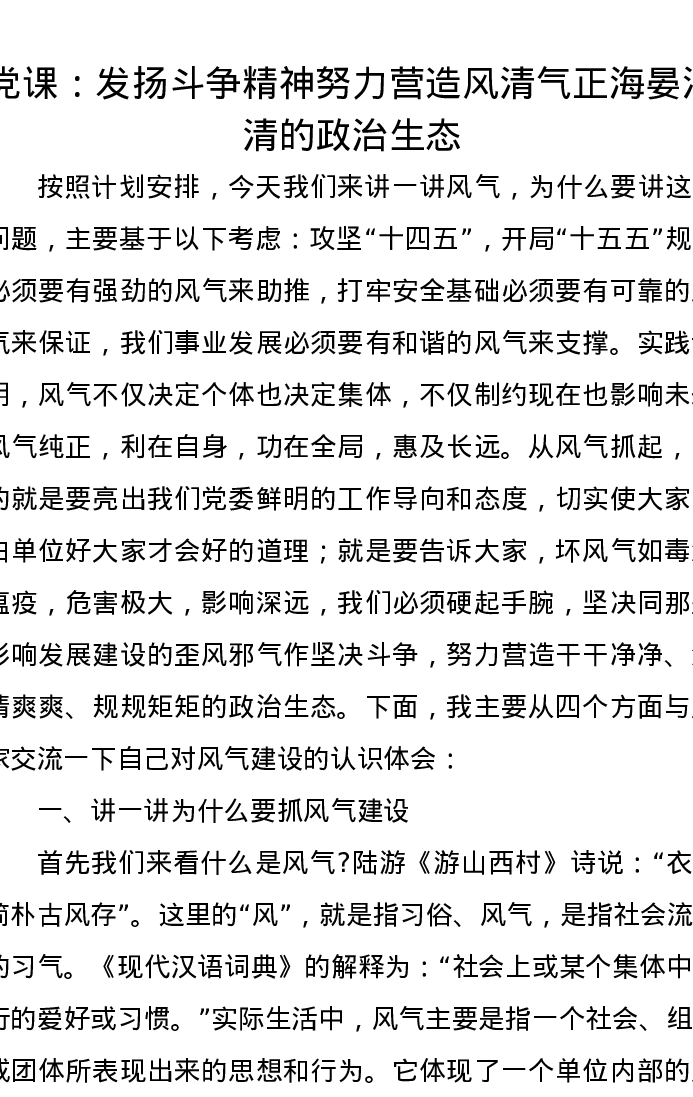 党课:发扬斗争精神 努力营造风清气正 海晏河清的政治生态