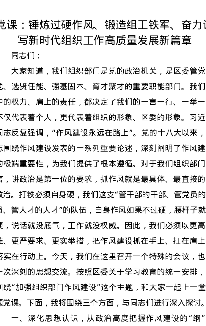 党课讲稿:锤炼过硬作风、锻造组工铁军、奋力谱写新时代组织工作高质量发展新篇章