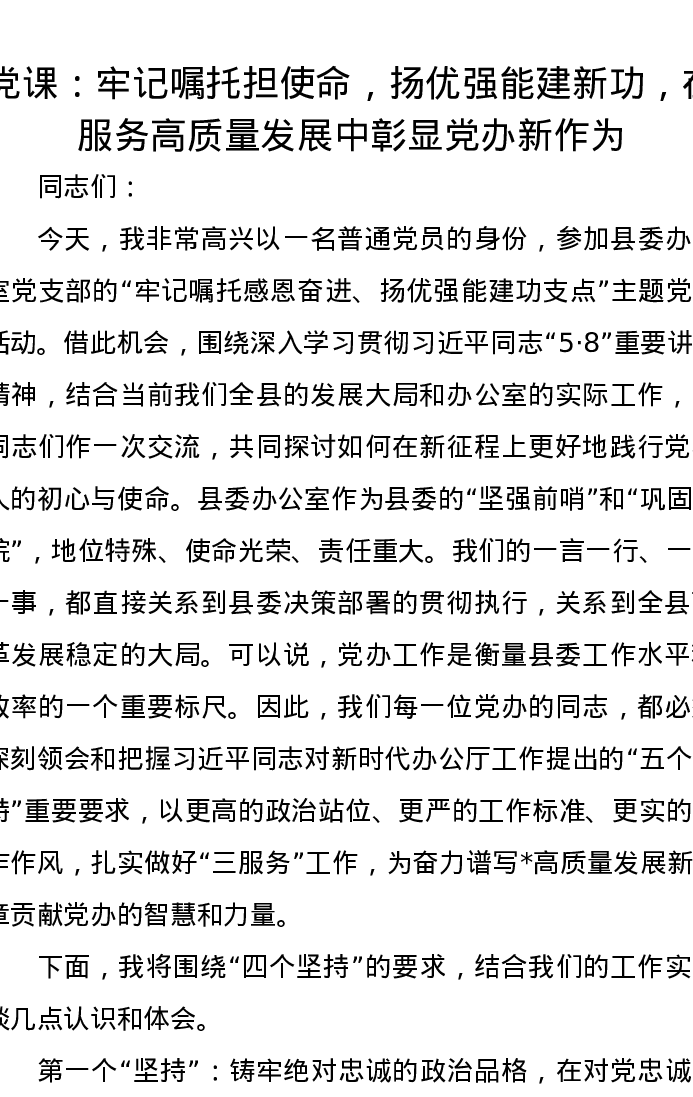 党课讲稿:牢记嘱托担使命,扬优强能建新功,在服务高质量发展中彰显党办新作为