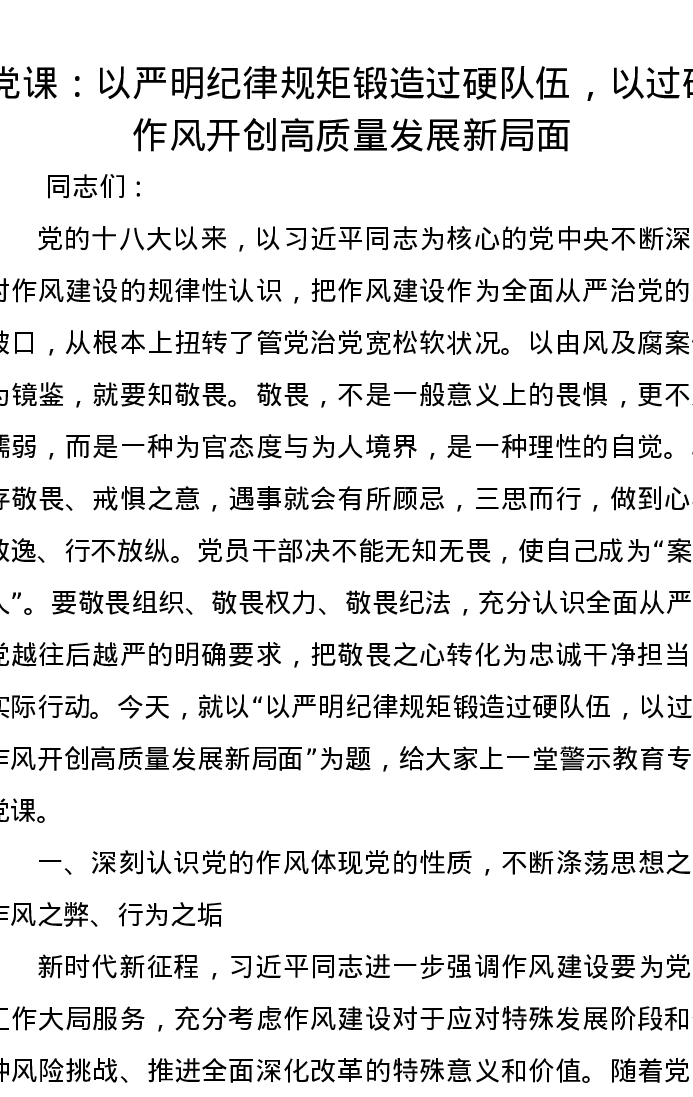 党课讲稿:以严明纪律规矩锻造过硬队伍,以过硬作风开创高质量发展新局面
