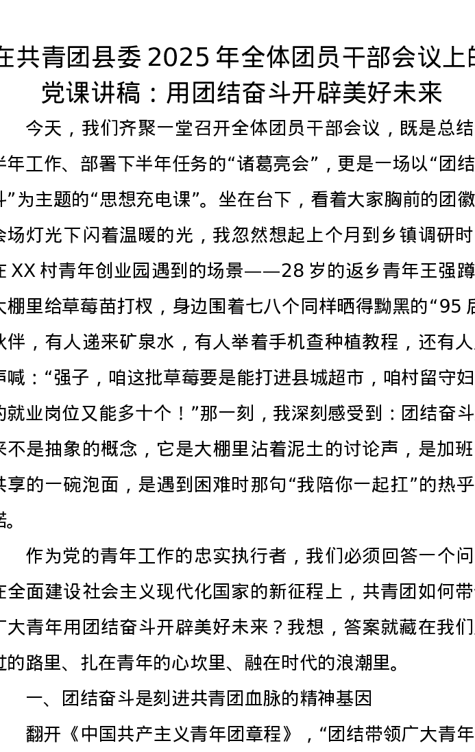 在共青团县委2025年全体团员干部会议上的党课讲稿:用团结奋斗开辟美好未来