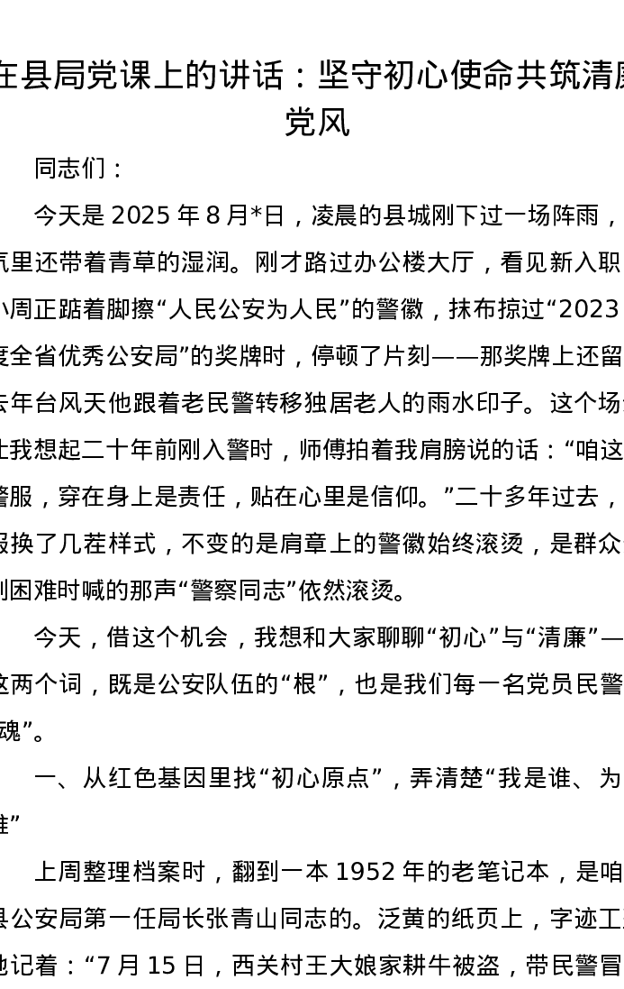 在县局党课上的讲话:坚守初心使命 共筑清廉党风