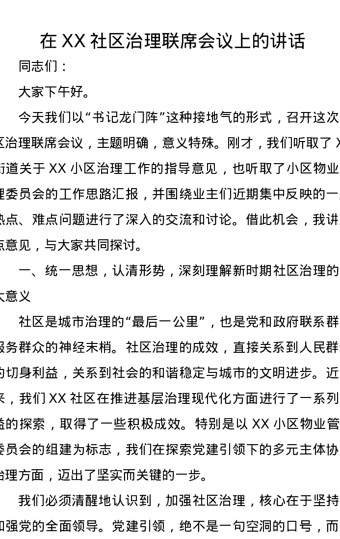 在XX社区治理联席会议上的讲话