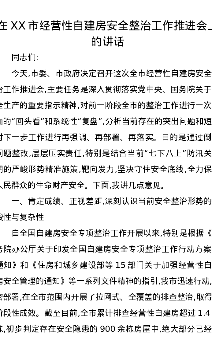 在XX市经营性自建房安全整治工作推进会上的讲话