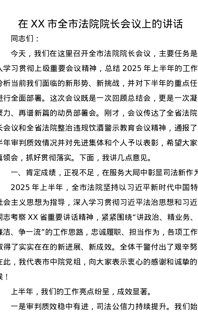 在XX市全市法院院长会议上的讲话