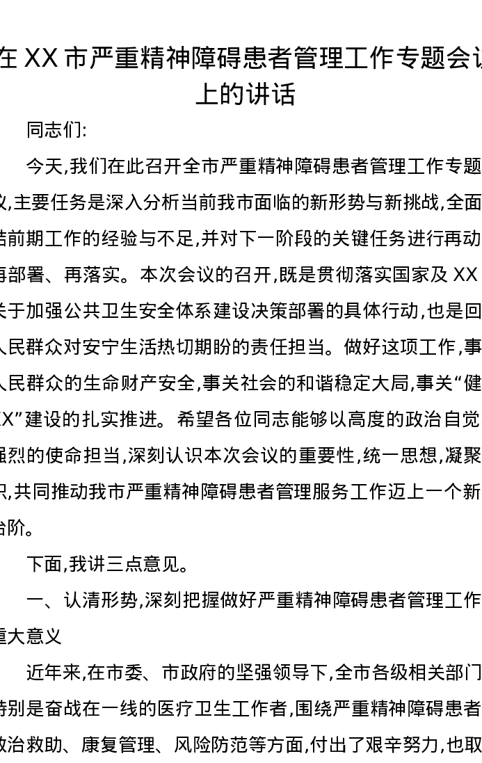 在XX市严重精神障碍患者管理工作专题会议上的讲话