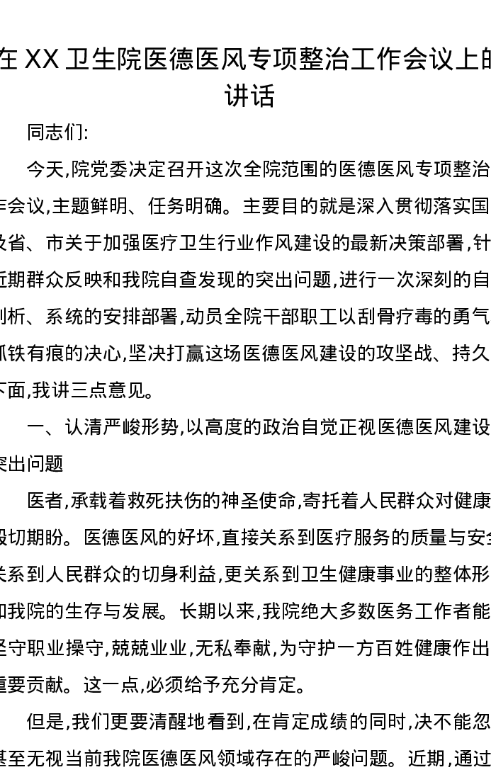 在XX卫生院医德医风专项整治工作会议上的讲话