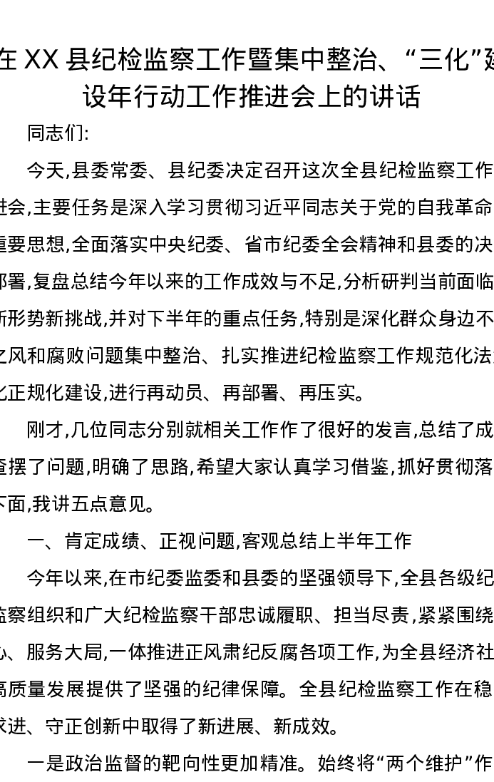 在XX县纪检监察工作暨集中整治、“三化”建设年行动工作推进会上的讲话
