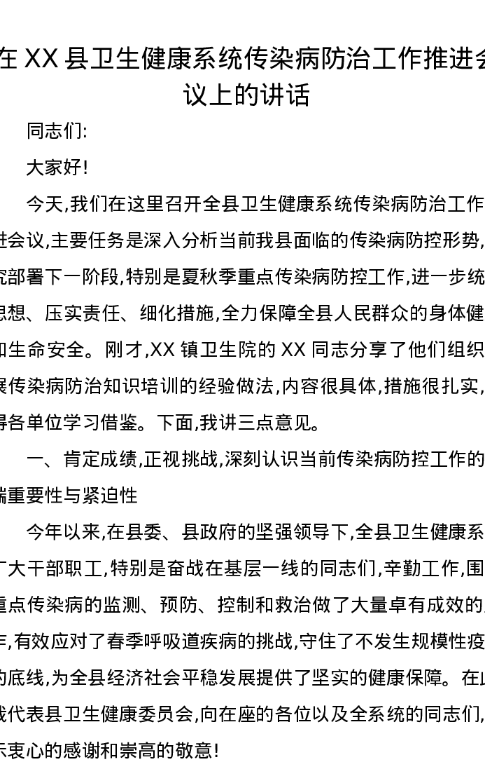 在XX县卫生健康系统传染病防治工作推进会议上的讲话
